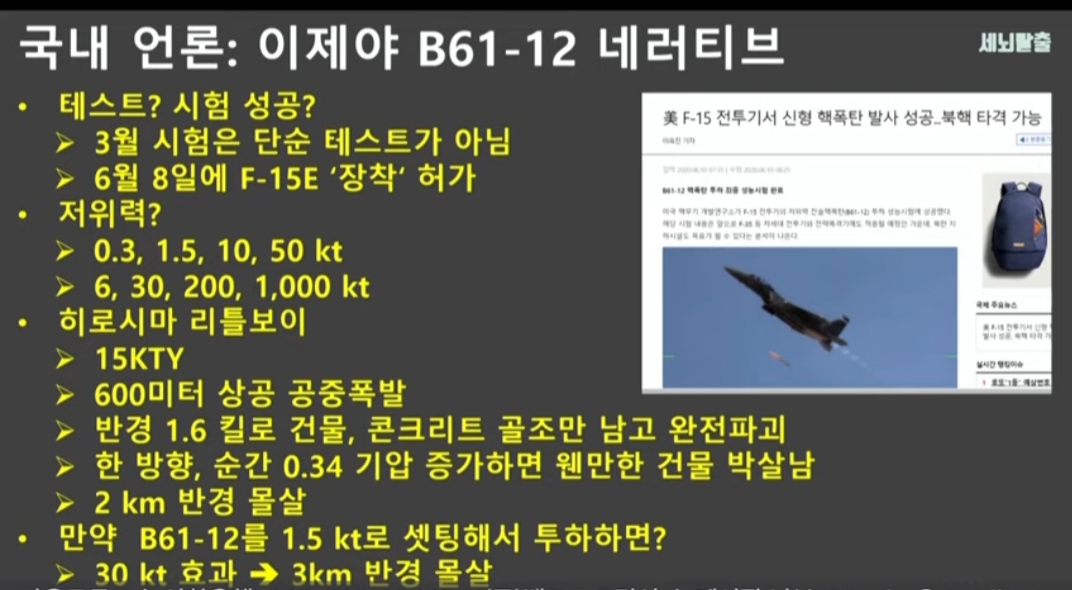 미국의 핵무기개발연구소가 F-15 전투기의 저위력 전술핵폭탄 투하 성능시험을 성공적으로 완료했다고 발표했습니다. 개량형 저위력 전술핵폭탄 시험인데, 이 핵폭탄은 미국의 핵무기 현대화 프로그램의 핵심 가운데 하나로 지하시설 타격도 가능한 것으로 알려졌습니다. 김동현 기자가 취재했습니다. (영상취재: 김선명 / 영상편집: 조명수)