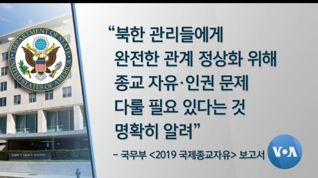 미국 국무부는 연례 ‘국제종교자유’ 보고서를 통해 북한은 관계 정상화를 위해 종교 자유와 인권 문제를 해결해야 한다고 밝혔습니다. 샘 브라운백 국무부 국제종교자유대사는 종교 탄압에 공격적이고 지독한 북한의 상황은 개선되지 않았다면서 정상국가처럼 주민들의 종교 자유를 인정할 것을 북한에 촉구했습니다.