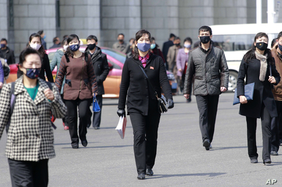 지난 4월 북한 평양의 거리에서 시민들이 신종 코로나바이러스 감염증(COVID-19)을 막기 위해 마스크를 착용하고 있다.