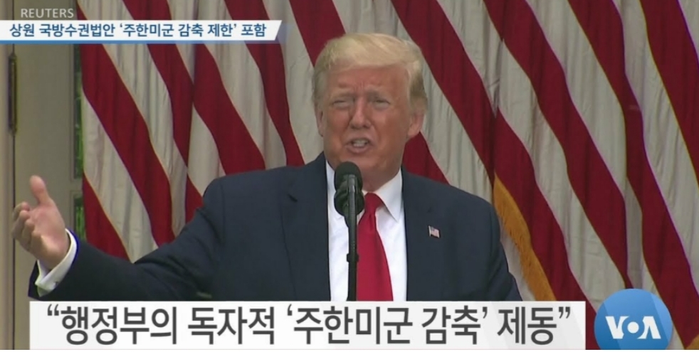 미국 의회가 주한미군 감축에 관한 행정부의 독자적 결정에 제동을 걸 수 있게 하는 내용의 조항이 미국 상원의 2021회계연도 국방수권법안에 포함된 것으로 확인됐습니다. 최근 트럼프 행정부가 주독일 미군 병력 감축 계획을 통보한 뒤 일각에서는 한국 일본 등을 포함한 미군 병력 감축 가능성이 언급됐는데, 미국 의회 내 상황은 다릅니다.