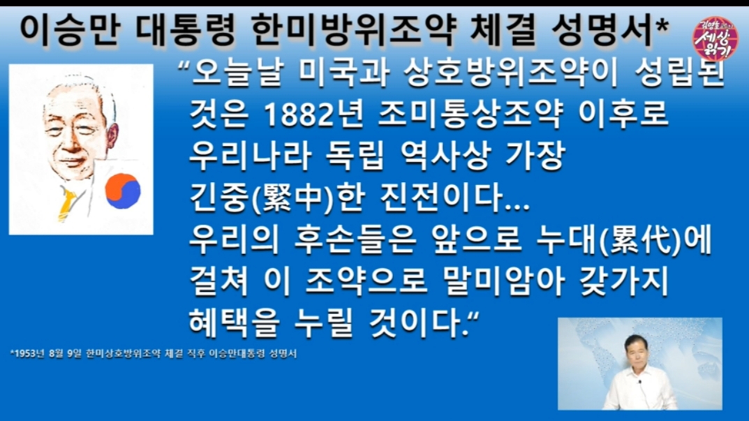 주님께서 대한민국에 준 가장 큰 축복은 이승만을 통한 건국의 역사, 한미상호방위조약을 이끌어낸 역사이다.. 자유민주주의가 존립하기 불가능해 보이는 사막의 토양에 인간적 사고에선 존재 불가능한 샘물을 터뜨려 강을 만든 역사이다.