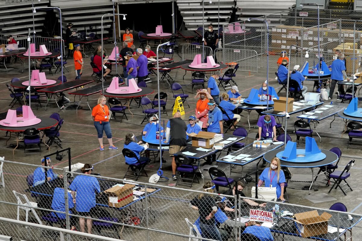 애리조나주 상원의 의뢰로 선거 감사 진행 중인 사이버 닌자스 고용자들이 애리조나주 피닉스시 재향군인 기념관에서 2020년 선거 투표지를 조사하고 재검표하고 있다. 2021.5.6 | Matt York/Pool/AP Photo 연합