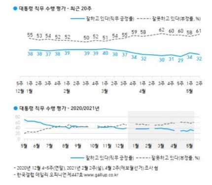 文 국정수행 지지율 32%(2%p↓), 부정평가 61%(3%p↑)...거의 두배