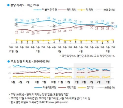 국민의힘 역시 전주 대비 1%포인트 하락한 27%였지만 민주당과의 격차는 4주만에 다시 1%포인트로 좁혀졌다.지지정당이 없는 무당(無黨)층은 30%였으며, 이어 정의당 6%, 국민의당 5%, 열린민주당 3%, 그 외 정당/단체의 합이 1%다.