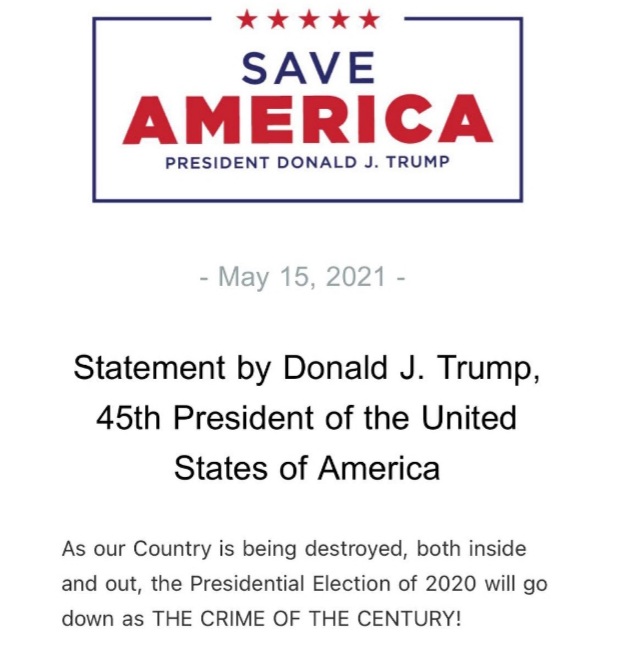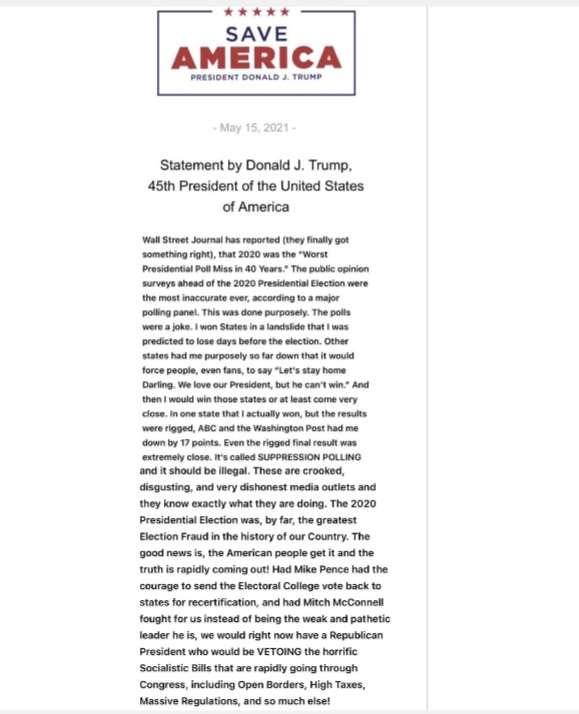 MAY 15, 2021 BEDMINSTER, NJ Statement by Donald J. Trump, 45th President of the United States of America.