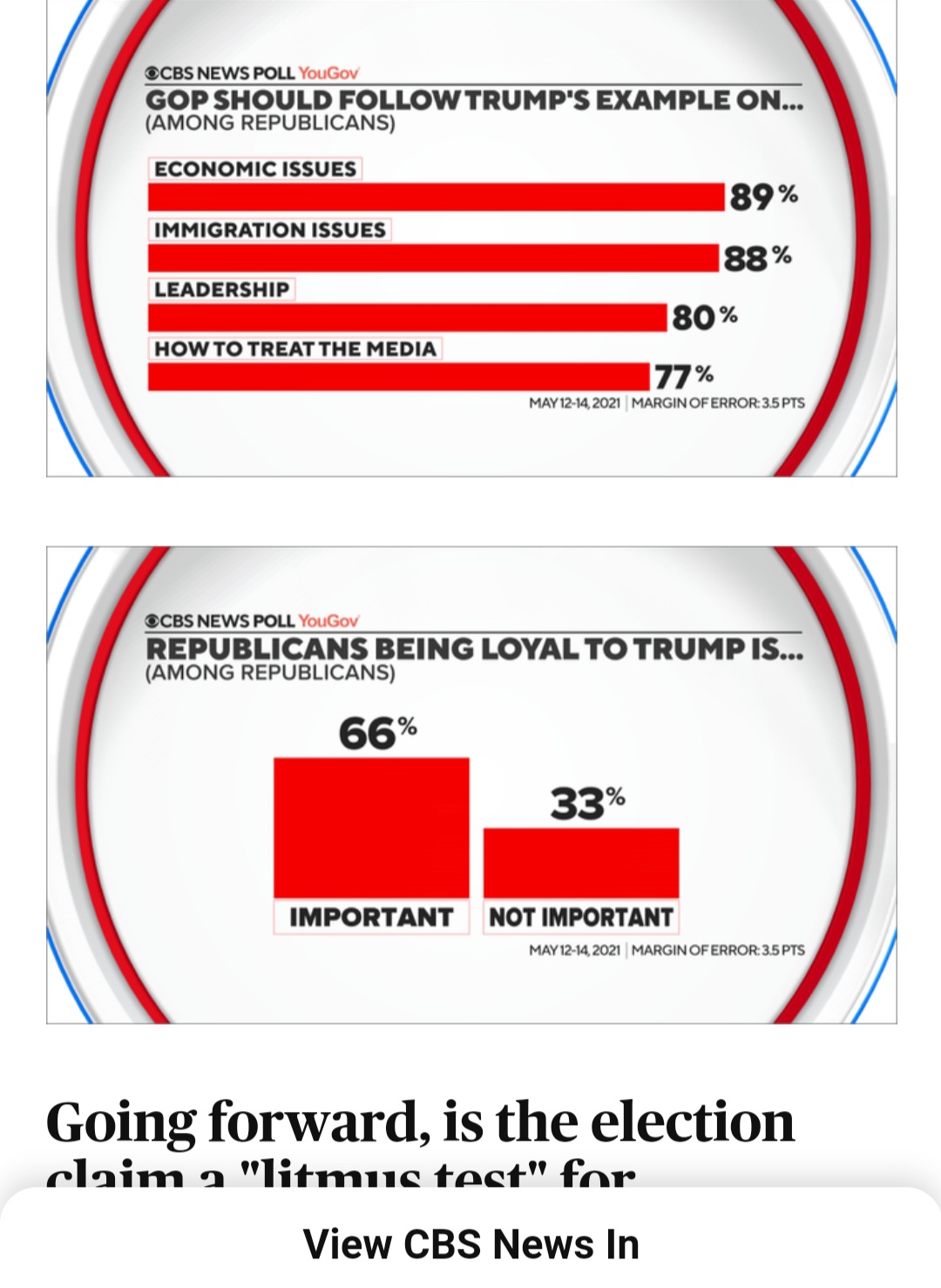 Breaking News! New polling by CBS News on the state of the Republican Party (which is very strong!). “President Trump has a strong hold on the GOP.” 80% of Republicans agree with the removal of Liz Cheney from GOP Leadership and only 20% disagree.