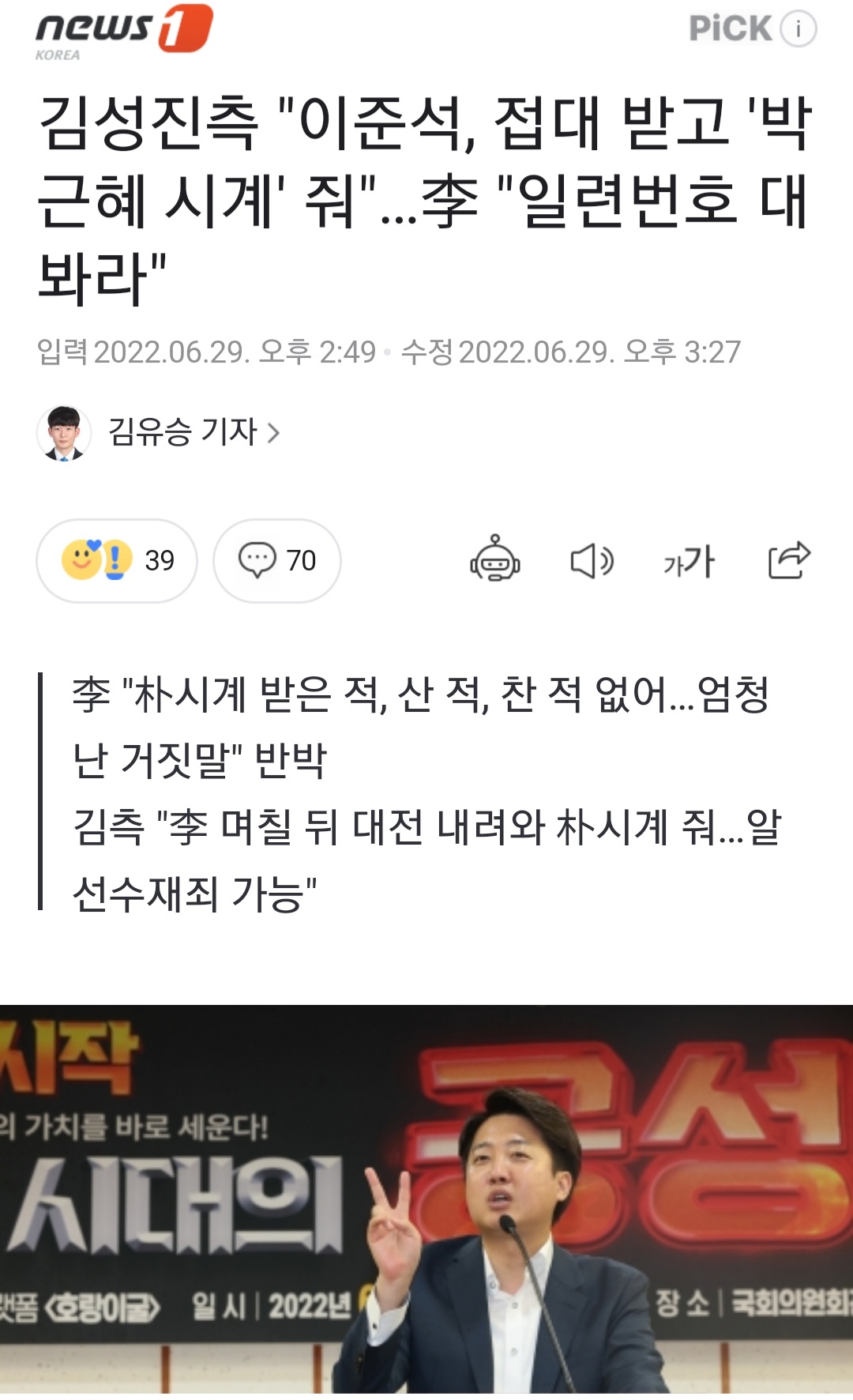 이준석이 김성진에게 ‘박근혜 시계’ 준 까닭은? 이준석 “엄청난 거짓말이다. 박근혜 시계를 받은 적도 없고 구매한 적도 없고 찬 적도 없고 따라서 누군가에게 줄 수도 없다” 반박