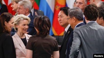 29일 스페인 마드리드에서 열린 나토 정상회의에서 윤석열 한국 대통령(오른쪽 3번째)과 저신다 아던 뉴질랜드 총리(왼쪽 1번째), 우르줄라 폰 데어라이엔 유럽연합 집행위원장(왼쪽 2번째) 등 참석자들이 대화하고 있다.