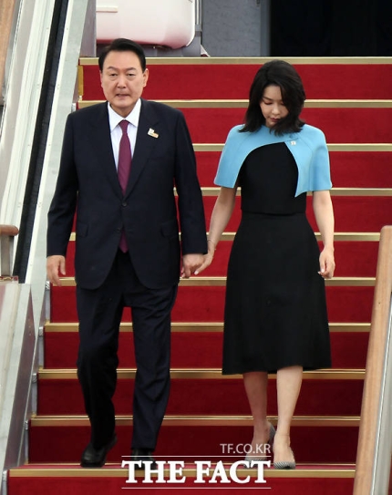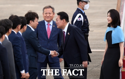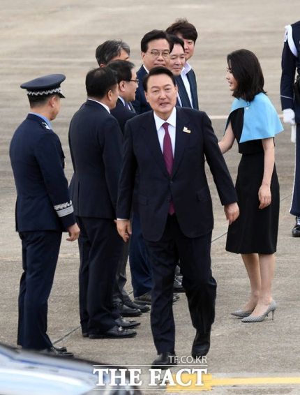 이날 서울공항에는 이상민 행안부 장관을 비롯한 비서실장, 안보실장, 정무수석, 이준석 국민의힘 대표 등 국무위원과 당 지도부가 마중을 나와 윤 대통령 부부의 귀국을 반겼다.