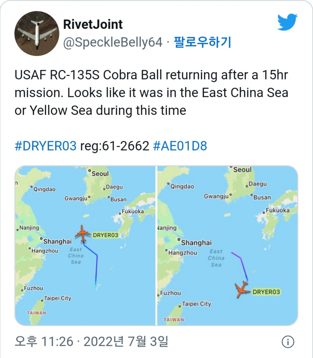 북한의 탄도미사일을 감시하는 미 공군 정찰기 RC-135S 코브라볼이 3일 동중국해 상공에 출격했습니다. 군용기 위치 정보를 추적하는 트위터 계정인 ‘리벳조인트’ 등에 따르면 코브라볼은 이날 일본 오키나와 가데나 미 공군기지에서 이륙한 뒤 동중국해와 서해를 비행했습니다.