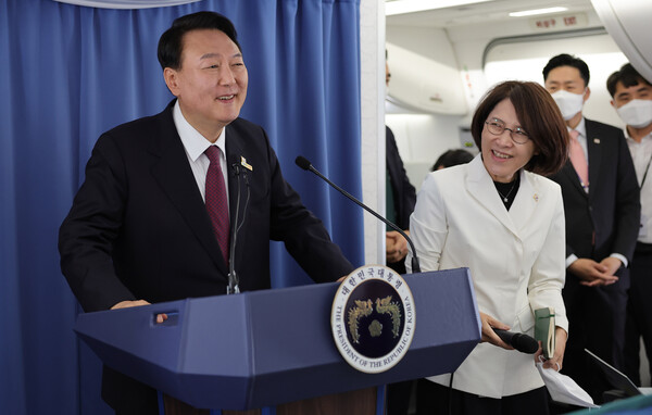 윤석열 대통령이 30일(현지시간) 북대서양조약기구(NATO·나토) 정상회의 참석을 마친 뒤 귀국길 공군 1호기에서 기자간담회를 하고 있다. 사진=연합뉴스