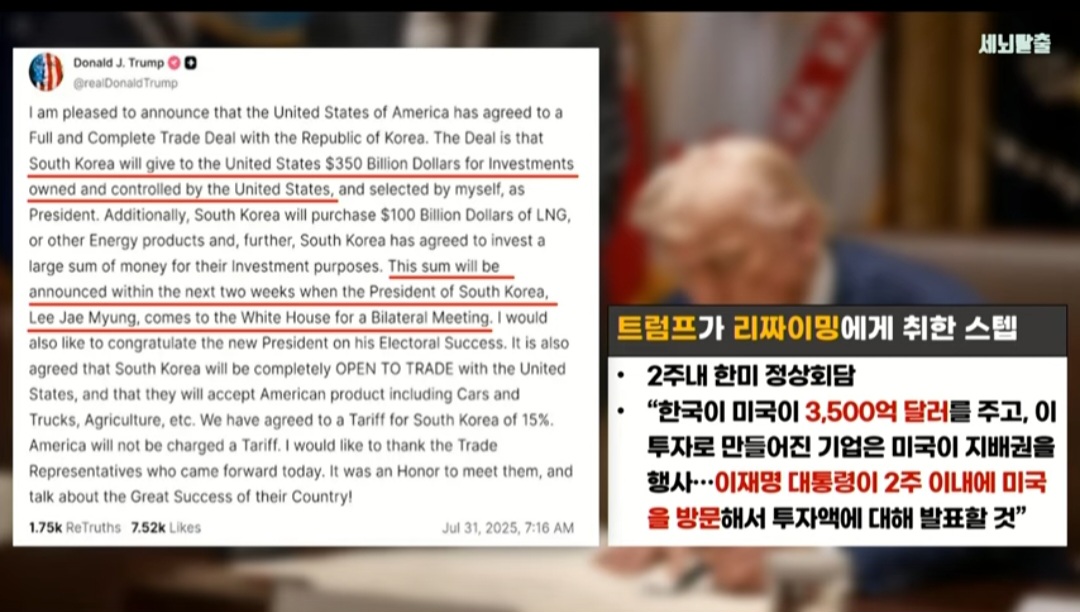 ■[세뇌탈출 3603탄] 한미협상 타결|EU 6.3배, 일본 1.5배 투자 약속|삼성·현차가 미국으로 이민갈 판|트럼프는 김정은 대신 리짜이밍과 통큰 빅딜?