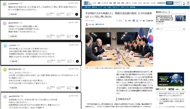 다른 댓글에서도 “한국이 트럭이든 농산물이든 관세를 낮춘 것은 일본보다 내용이 나쁜데도 일본과 비교하면 패배가 아니라고 한국 정부가 말한다”며 “저기의 정치 상황은 괜찮은 것인가?(あっちの政治状況は大丈夫なんかな)”라고 반문했다.