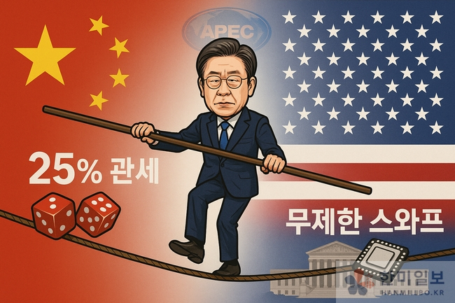 한미 무역협상 교착. 좌측 중국·우측 미국 사이 외줄타기하는 이재명 정권의 ‘도박과 줄타기’ 전략을 상징한 그래픽. 한미일보