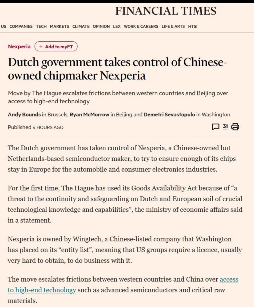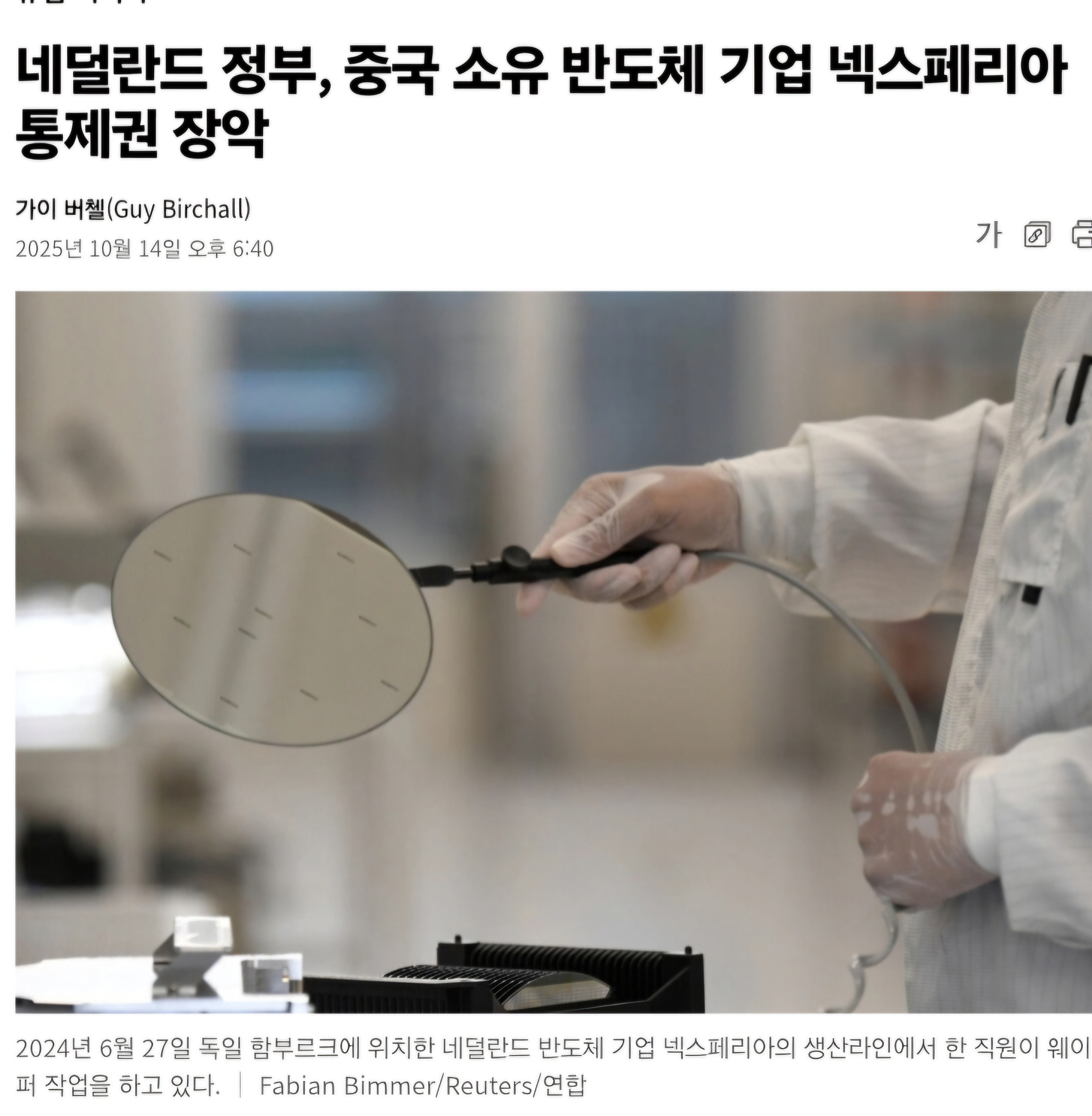 네덜란드 정부가 중국 소유의 반도체 기업 *넥스페리아(Nexperia)*의 통제권을 공식적으로 장악했다.