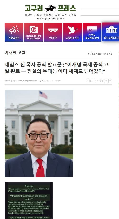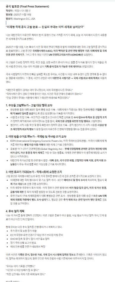 “2025년 11월 13일, 나는 복수의 시민 및 해외 연대 단체들과 함께 이재명에 대한 국제 고발 절차를 공식적으로 완료하였다. 고발 문건은 국제형사재판소(ICC), 미국 백악관 및 관련 연방 행정부 기관, 대북제재 및 국제 인권 관련 국제기구, 그리고 후속 대상 기관인 UN 인권최고대표사무소(OHCHR)을 포함한다.