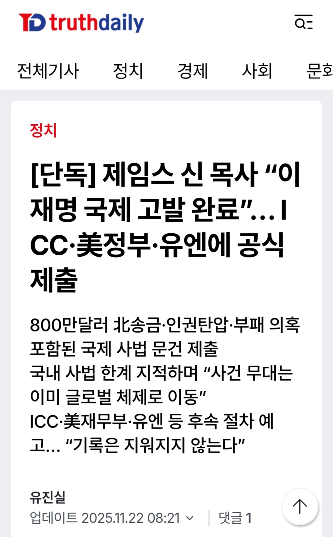 ■제임스 신 목사 공식 발표문 : “이재명 국제 공식 고발 완료 — 진실의 무대는 이미 세계로 넘어갔다”