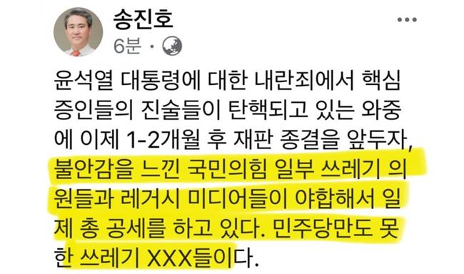 이런 가운데 윤 전 대통령 측 변호인단에 있는 송진호 변호사는 23일 자신의 페이스북 피드에서 “재판 종결을 앞두자 불안감을 느낀 국민의힘 일부 쓰레기 의원들과 레거시 미디어들이 야합해서 일제 총공세를 하고 있다”며 “민주당만도 못한 쓰레기 XXX들”이라고 강도 높게 비판해 화제가 되고 있다.