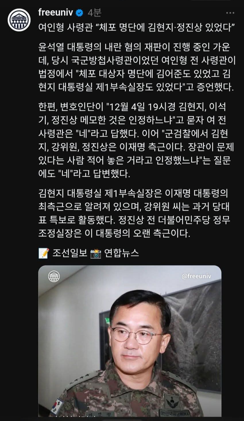 - 여인형 전 국군방첩사령관, 尹 대통령 내란 혐의 형사재판에 증인으로 나와
