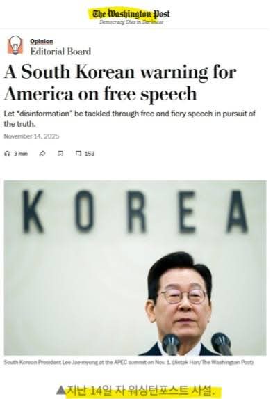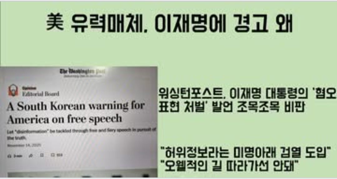 미국의 양대 신문인 워싱턴포스트에서 이재명의 '혐오표현 처벌' 발언을 정면으로 비판하는 사설을 실었다.