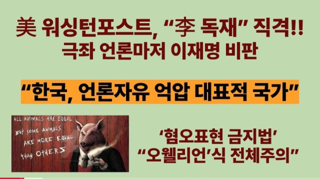 ■美 좌파 워싱턴포스트도 “한국은 언론자유 억압의 표본 국가”, “이재명, ‘동물농장’으로 가고 있어”, “오웰리언’식 전체주의”