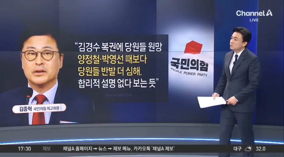 당원게시판의 내용을 전하는 김종혁 당시 국민의힘 최고의원의 발언을 그대로 크게 보도하는 채널A 보도 영상