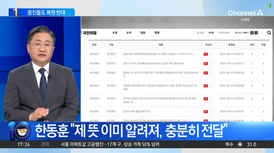 동아일보와 채널A 등은 곧바로 “당원게시판에서 윤 대통령 탈당 요구가 빗발친다”는 보도를 내보냈다. 이외에도 다수의 레거시 미디어는 즉각적으로 국힘 당원게시판 관련 기사를 쏟아냈다. 이때부터 ‘한동훈 등판론’이 언론을 통해 본격적으로 등장했다.