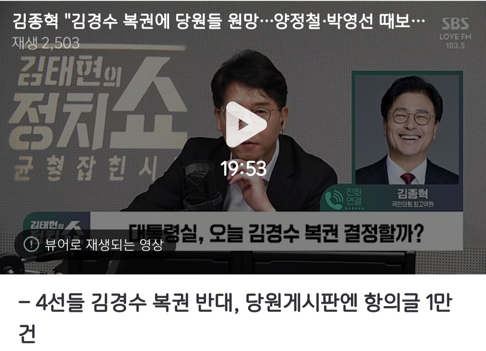 SBS김태현의 정치쇼에 김종혁 당시 최고위원이 전화 인터뷰를 하면서 당원게시판 내용을 그대로 전달하고 있다 / SBS김태현의 정치쇼 유튜브 갈무리
