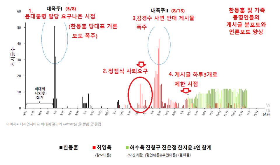 결국 2024년 11월 이후 한동훈 및 가족 명의로 대통령·영부인 비방글이 다수 발견되면서 본격적인 논란이 시작됐다.