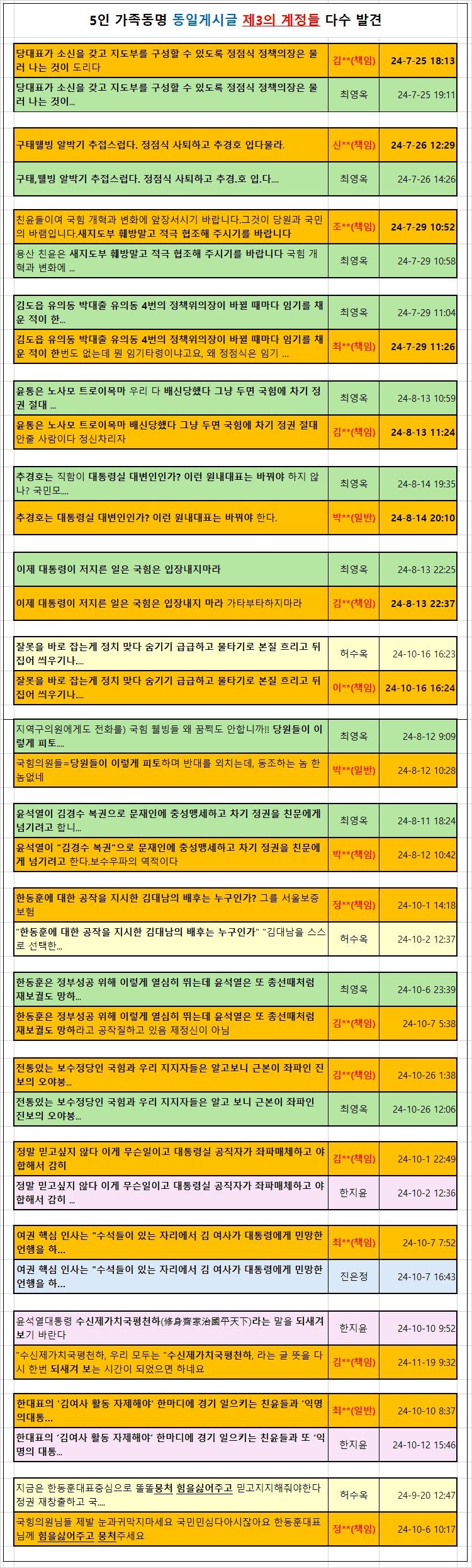 당원게시판 욕설 계정 논란의 실체가 드러나며, 해당 계정들이 한동훈 가족과 동일 명의·동일 번호 뒷자리·동일 지역구라는 사실이 공개돼 파문이 커지고 있다.