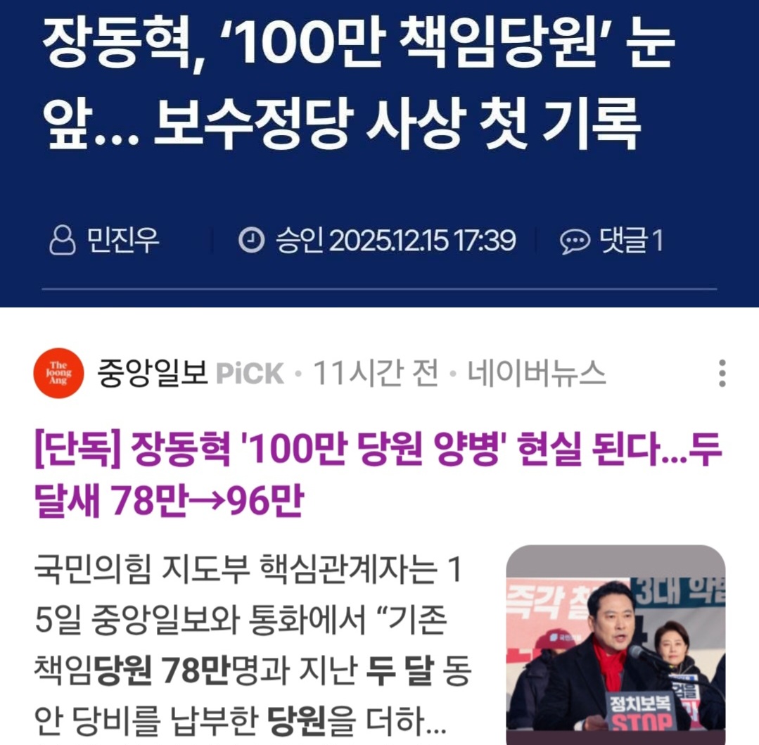 그런데 당원 중심 당 개혁, 계엄 사과 거부, 윤석열과의 절연 거부 등 당내 기회주의자들과 좌익 및 소위 조중동 프레임에 굴복하지 않은 장동혁 체제 출범 후 3개월만에 무려 25만명이나 신규 책임당원이 오히려 급증한 것이다. 장동혁은 한국 보수정당 당 대표 중 당총재와 대통령을 겸했던 이승만 박정희 김영삼이나, 대통령은 아니었지만 당대표였던 이회창 박근혜 이준석 한동훈 등 그 누구도 이룩하지 못했던 ‘책임당원 100만명’ 정당을 만들어낸 첫 당 대표라는 기록을 갖게 된다.