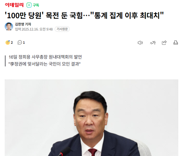한국 보수정당 사상 처음으로 장동혁 당 대표 체제하의 국민의힘 책임당원, 즉 당비를 내는 당원이 100만명을 넘어서는 ‘100만 책임당원’ 시대가 곧 열릴 것이 확실시된다. 한동훈 권영세 같은 자들이 당권을 장악하고 있을 때 수많은 당원들이 탈당해 책임당원 수는 한때 70만명대 초반까지 떨어졌다. 지난 8월 국힘 전당대회를 앞두고 다소 회복해 전당대회 당시 책임당원은 75만명이었다.