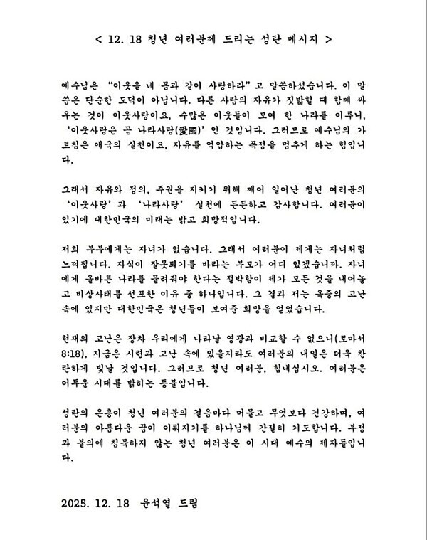 서울구치소에 수감 중인 윤석열 대통령이 18일 옥중에서 청년들을 향한 성탄 메시지를 발표했다. 그는 이어 "자녀에게 올바른 나라를 물려줘야 한다는 절박함이 제가 모든 것을 내려놓고 비상사태를 선포한 이유 중 하나"라고 주장했다. 자신의 결단이 권력 유지가 아닌 미래 세대인 청년들을 위한 희생이었다는 점을 강조한 것이다. 트루스데일리