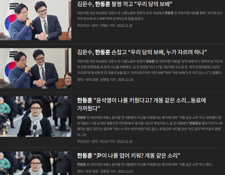 조선일보는 최근 <조갑제 "김문수·한동훈 손잡으면 국힘 변화...장동혁 체제 흔들"><[사설] ‘윤 어게인’ 달려가는 국힘, 당 존립 위기 맞을 것><[사설] 계엄 1년 앞두고 자중지란, 자멸로 가는 국힘><신천지를 “사이비”라고 했다고... 국힘, 한동훈 이어 친한계 징계 절차 착수> 등 다수의 기사와 사설을 써왔다.