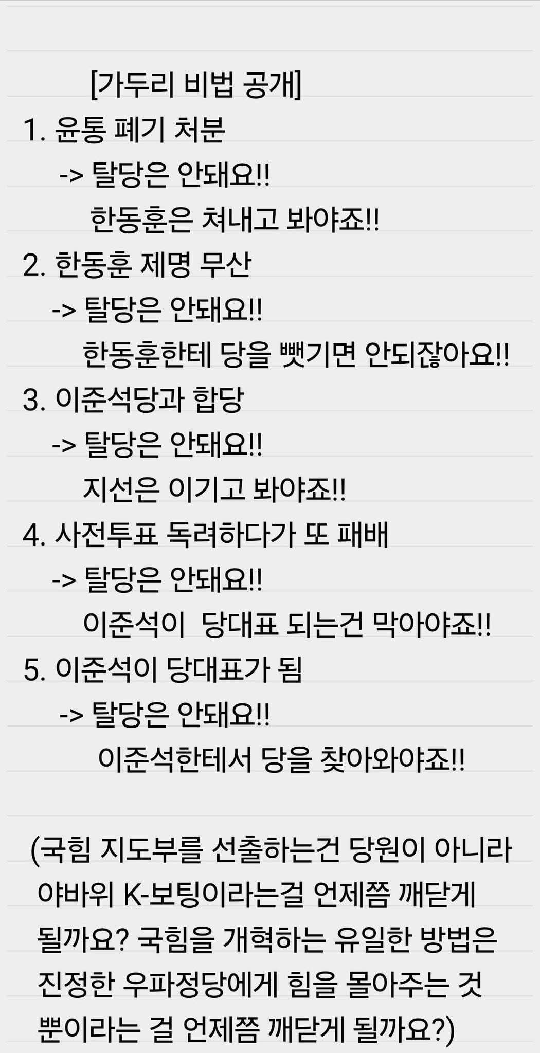 정당은 특정 인물의 존재 여부로 유지되는 팬클럽 집단이 아니다. 그런데 “그 사람을 건드리면 공멸한다”는 말은 결국 “그 사람은 예외”라는 특권 선언이다.