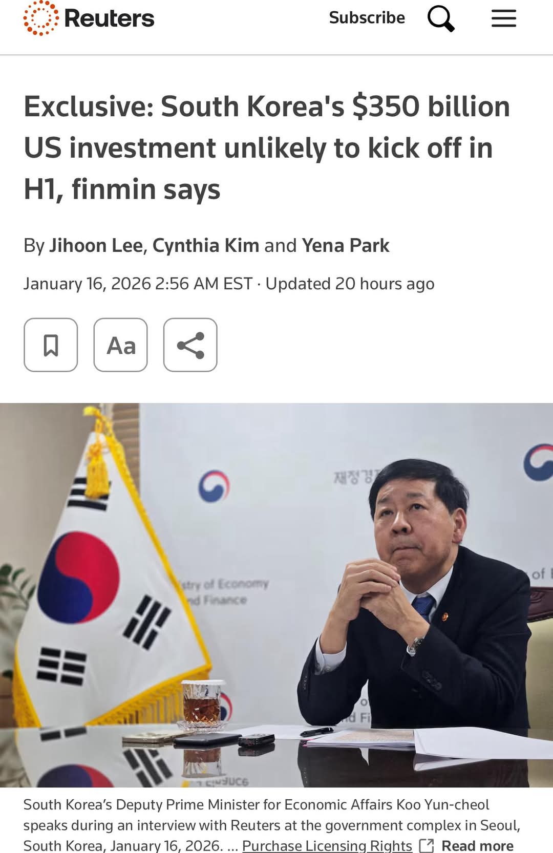 그런 가운데 1월16일 한국의 구윤철 부총리는 트럼프 행정부와 약속했던 연간 200억 달러(약 27조원) 규모의 대미 투자에 대해 올해 상반기에는 집행하기 어렵다고 공식적으로 밝히면서 약속 위반을 했다.