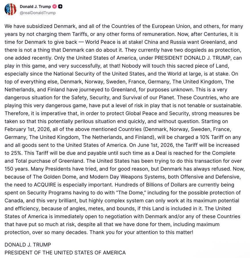 따라서 글로벌 평화와 안보를 보호하기 위해, 이 잠재적으로 치명적인 상황을 신속하고 단호하게 종결시키기 위한 강력한 조치가 반드시 필요하다. 2026년 2월 1일부터, 위에 언급된 모든 국가들(덴마크, 노르웨이, 스웨덴, 프랑스, 독일, 영국, 네덜란드, 핀란드)이 미국으로 수출하는 모든 상품에 10% 관세를 부과할 것이다. 2026년 6월 1일부터는 관세를 25%로 인상한다. 이 관세는 그린란드를 완전하고 전면적으로 구매하는 합의가 체결될 때까지 부과되며, 납부되어야 한다.