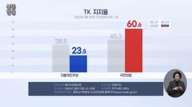 하지만, 당 윤리위원회에서 한동훈이 제명(14일)되고, 장동혁 대표가 단식(15일)을 시작하며, 국민의힘 지지율은 폭등했고, 대구경북의 지지율도 45.3%에서 60.6%로 15.3%나 폭등했다.