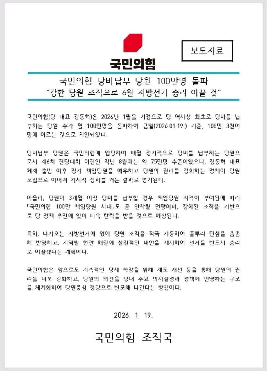 | 장동혁 국민의힘 대표, 닷새째 단식… "목숨 바쳐 싸우겠다" (3) | 2026.01.19 |
