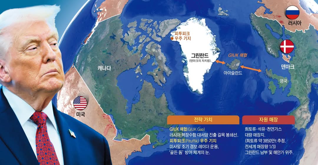 덴마크의 준자치령인 그린란드는 새로 열리는 북극 항로를 포함한 핵심 해상로를 가로지르는 전략 요충지이며, 희토류와 핵심 광물이 풍부한 지역으로 알려져 있다.