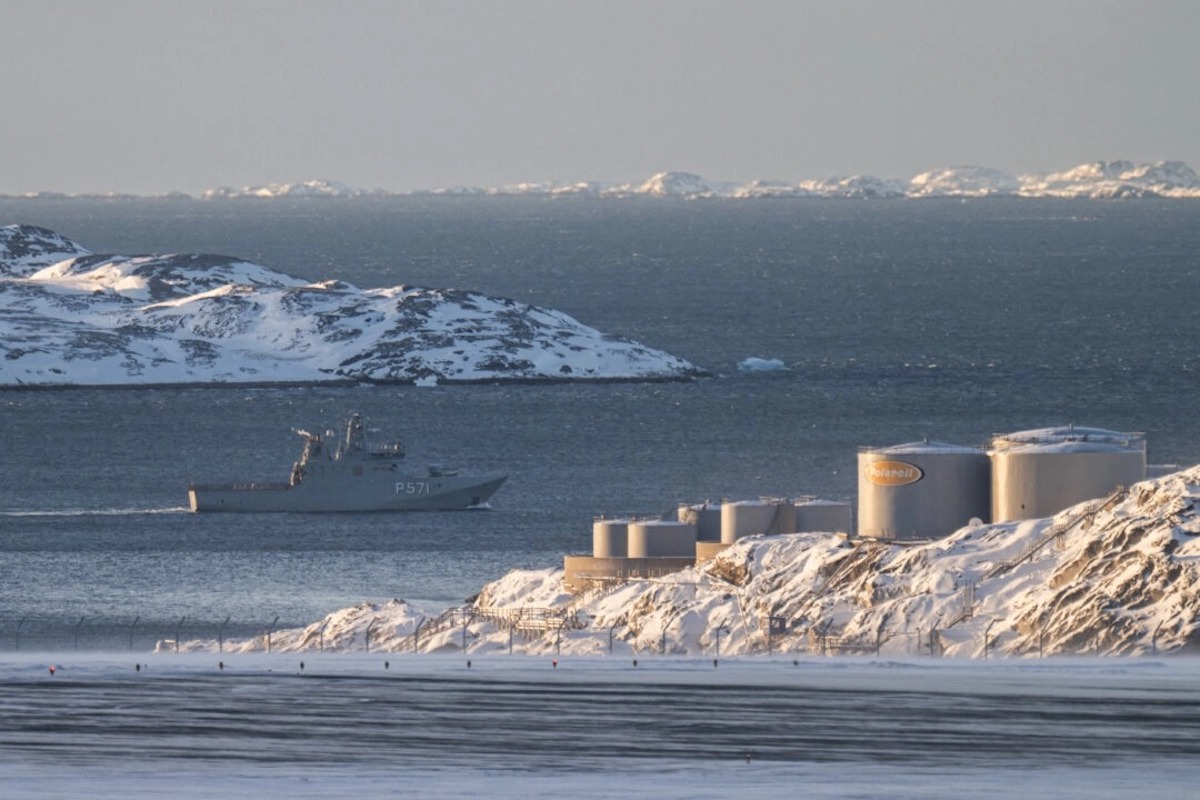 눈 덮인 섬들이 배경을 이루는 가운데, ‘P571' 표식이 있는 순찰선 한 척이 2026년 1월 20일(현지시간) 그린란드 누크 공항 인근 해안에서 연료 저장 탱크를 지나 항해하고 있다. | Jonathan Nackstrand/ AFP via Getty Images