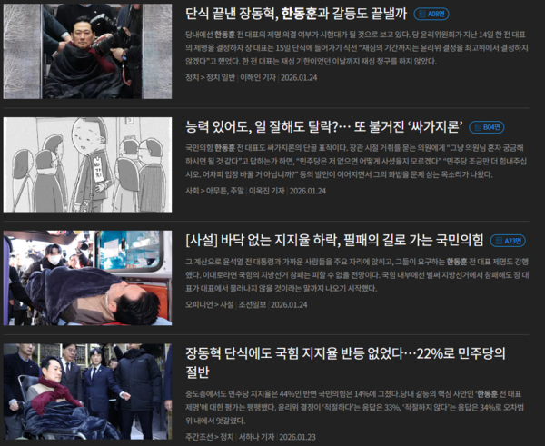 조중동 등 보수를 자처해온 레거시 미디어들은 24일 보도에서 국민의힘을 향해 “바닥 없는 지지율 하락, 필패의 길” 등의 제목으로 국민의힘을 걱정하는 듯한 사설과 칼럼을 한가득 싣고 있다. 그러나 내용을 뜯어보면 국민의힘 전체를 위한 충언이라기보다, 장동혁 대표 체제를 흔들고 한동훈 제명 결정을 되돌리려는 정치적 의도가 뚜렷하다.