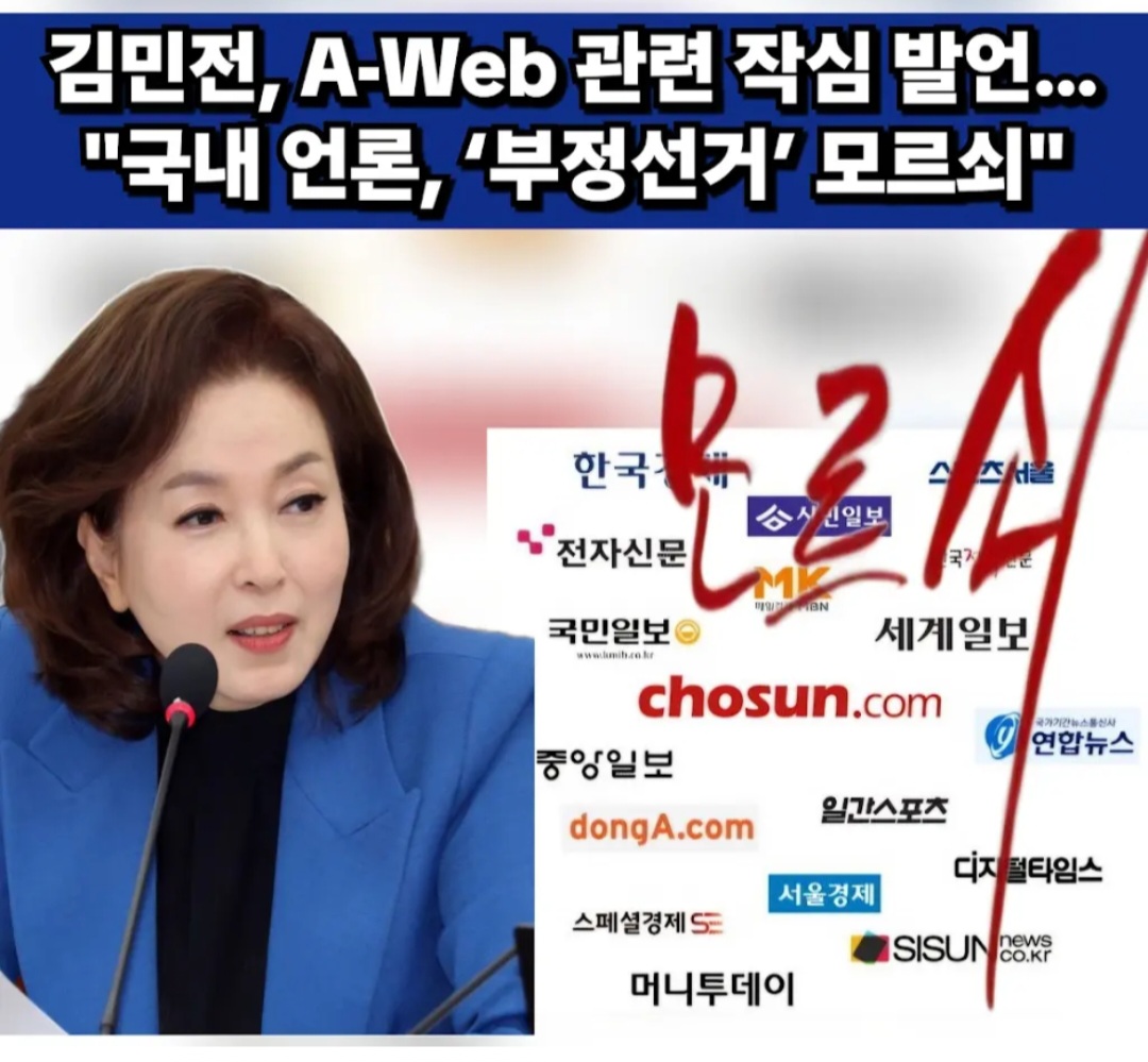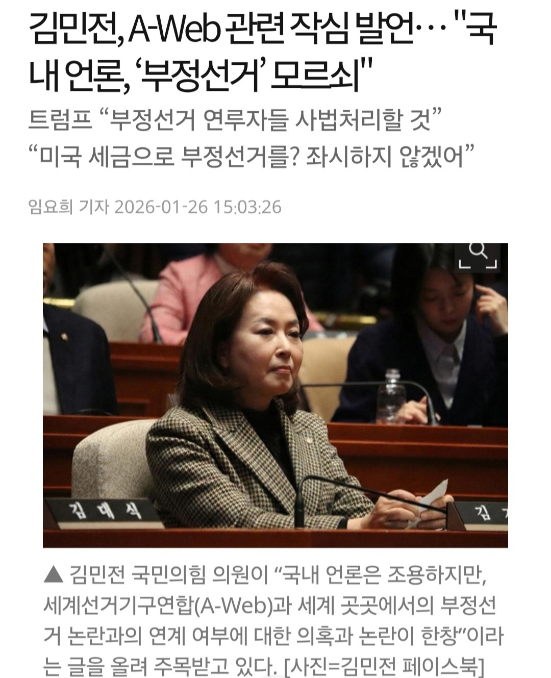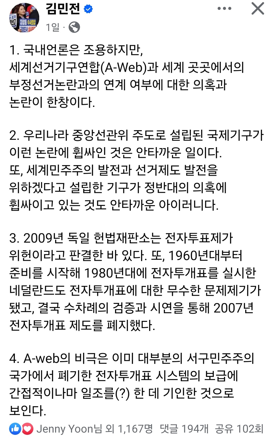 국민의힘 김민전 의원이 25일 SNS를 통해 세계선거기구연합(A-Web)을 둘러싼 논란을 언급하며 전자투·개표 시스템의 문제점을 강하게 지적했다.