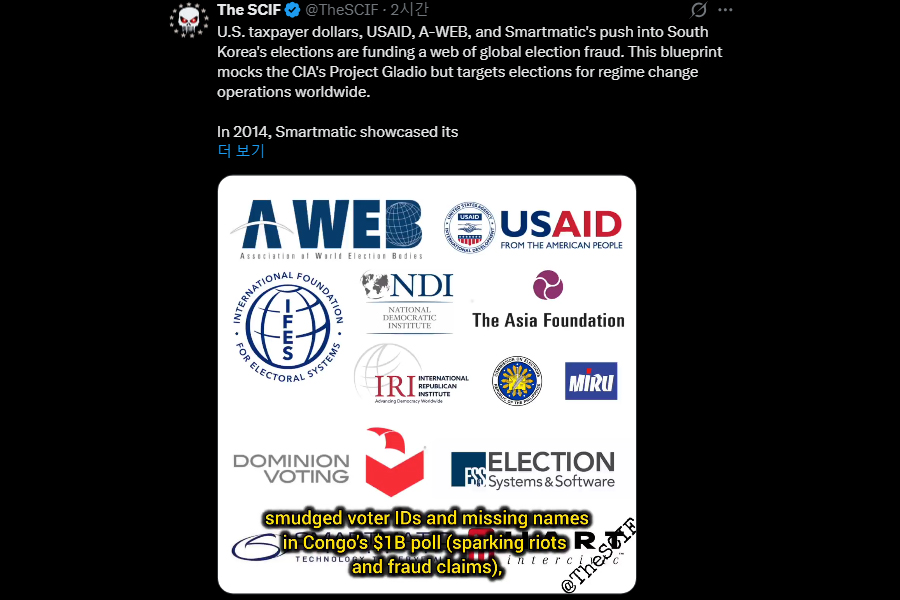 The SCIF는 미국 납세자 자금과 USAID, A-WEB, 스마트매틱, 미루시스템즈 등 국제 선거 기관·기업 네트워크가 한국을 거점으로 전 세계 선거에 영향을 미치는 구조를 형성하고 있다고 주장하며, 콩고 선거에서의 유권자 신분증 훼손과 명단 누락 사례 등 해외 논란을 함께 제시하고 있다. The SCIF의 X 계정 캡처
