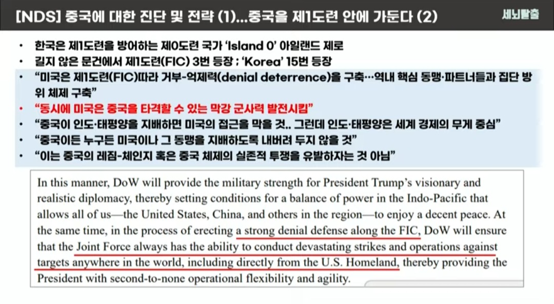 2026년 NDS의 중국에 대한 메시지는 훨씬 냉정하다. 중국이 미국과 동맹의 접근권과 주도권을 침해하지 못하도록 힘으로 억제하겠다는 전략을 공식화 했으며, ‘중국이 넘지 말아야 할 선을 미국이 직접 설정하고 관리하겠다’는 데 있다.