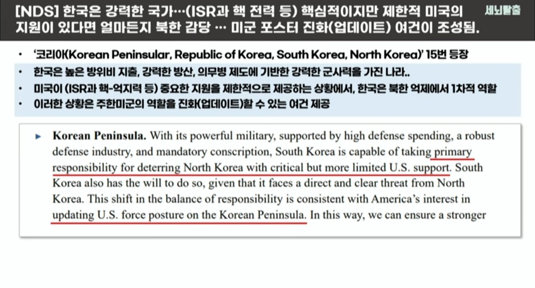 앞으로 한반도에서 전쟁이 발생할 경우, 가장 먼저 싸워야 할 주체는 한국이며, 미국은 동맹을 유지하되 핵우산과 후방 지원의 역할에 머문다는 것이다.