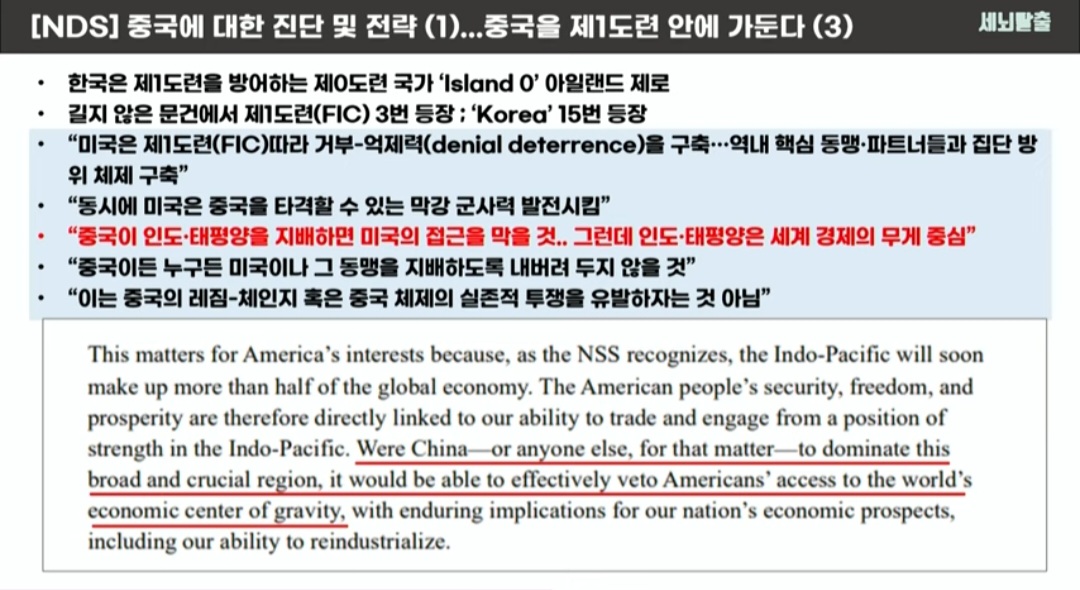 2026년 NDS의 중국에 대한 메시지는 훨씬 냉정하다. 중국이 미국과 동맹의 접근권과 주도권을 침해하지 못하도록 힘으로 억제하겠다는 전략을 공식화 했으며, ‘중국이 넘지 말아야 할 선을 미국이 직접 설정하고 관리하겠다’는 데 있다.