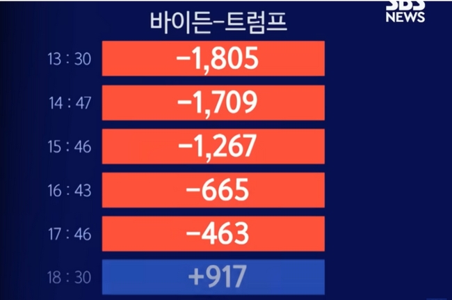 ▲2020년 선거 당시 시간대별 바이든과 트럼프의 표 차이. 바이든이 막판 역전한 곳으로 이후 꾸준하게 부정선거 의혹이 제기돼 왔다.