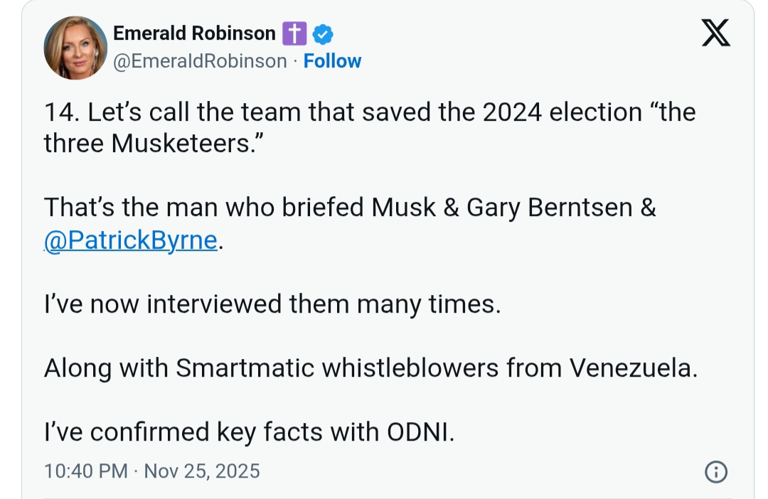 이 게시물이 올려졌던 당시에는 뉴스맥스와 원어메리카뉴스(OANN)에서 백악관 특파원을 지낸 에머럴드 로빈슨(Emerald Robinson)이 일련의 엑스 게시글을 통해 삼총사(패트릭 번, 개리 번슨, 일론 머스크)가 2024년 선거를 구했다고 폭로했던 때였다.