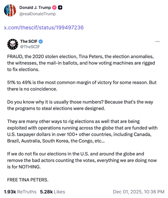 SCIF의 게시물은 티나 피터스(Tina Peters)를 석방하라는 내용의 글이었는데, 그녀가 2020년 '도둑맞은 선거'에서 투표기계들이 어떻게 선거를 조작했는지에 대한 증인이라고 주장했다.